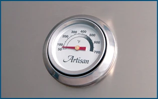 The Artisan AAEP-32 32 In. American Eagle Series Grill offers an impressive array of features normally found only on much more expensive models. It is built from all 304 series stainless steel for long lasting beauty and resistance to the elements, and it features a seamless welded double-skin hood with hand-polished accents and full width handle. Two stainless steel tube U-burners ensure a long service life with 20,000 BTUs of powerful heat output. Its powerful 9v electronic ignition with special gas capture covers and 600-degree heat-resistant encased wiring ensures easy, fast, and reliable start up. Two-position warming rack stores conveniently up out of the way when not in use. Warming rack and grill racks are made from solid stainless steel rod for long life and easy cleaning. Recessed vertical control panel protects chrome knobs and switches from the elements. Unique air curtain chimney design keeps controls cool to the touch even with lid closed. A convenient thermometer is built into the hood for accurate oven roasting temperatures.