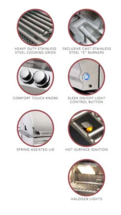 This grill features sleek styling with seamless control panel double-walled tear-drop hood with warming rack, stainless rod cooking grids, 3 main burners producing 75000 BTUs and 660 square inches of cooking surface (30 x 22 main grilling area).